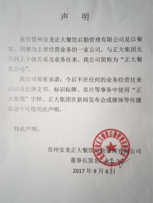 附件:贵州安龙正大餐饮后勤管理有限公司董事长邱飞签名的声明材料