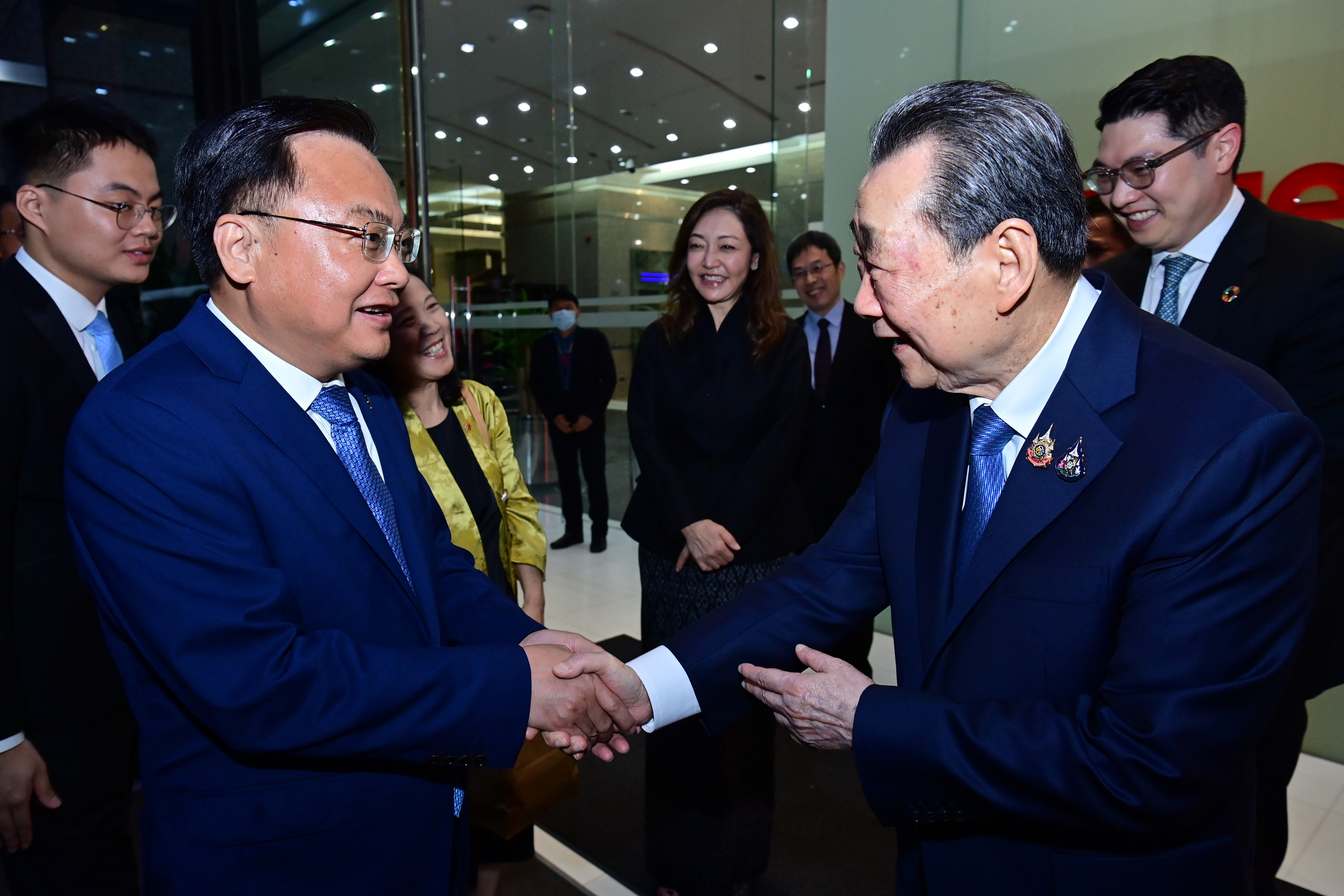 ▲张建卫大使(左)到访泰国曼谷AOA体育·(中国)官方网站,与谢国民集团资深董事长亲切握手。